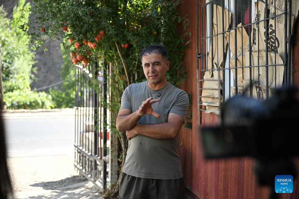 O morador Kishwar fala durante entrevista em sua casa, ao lado do trecho da segunda fase da Rodovia China-Tadjiquistão, perto de Kalai Khumb, Tadjiquistão, em 11 de setembro de 2025. A Rodovia China-Tadjiquistão, também conhecida como Rodovia Pamir, foi construída na década de 1940. Com mais de 1.000 km de extensão, de Dushanbe a Karasu, na fronteira entre a China e o Tadjiquistão, ela é vital para o transporte e as conexões externas do Tadjiquistão. (Xinhua/Li Renzi)