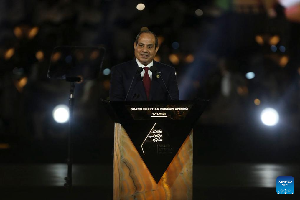 O presidente egípcio Abdel-Fattah al-Sisi discursa na inauguração do Grande Museu Egípcio (GEM, na sigla em inglês) em Gizé, Egito, em 1º de novembro de 2025. Após duas décadas de construção, o Egito inaugurou no sábado o GEM, o maior museu do mundo dedicado a uma única civilização, durante uma grande cerimônia realizada perto das pirâmides e da Esfinge, marcando um evento cultural histórico para o país, conhecido por sua rica herança. (Xinhua)