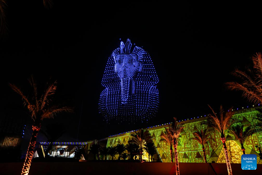Foto tirada em 1º de novembro de 2025 mostra apresentação de drones e luzes na inauguração do Grande Museu Egípcio (GEM, na sigla em inglês) em Gizé, Egito. Após duas décadas de construção, o Egito inaugurou no sábado o GEM, o maior museu do mundo dedicado a uma única civilização, durante uma grande cerimônia realizada perto das pirâmides e da Esfinge, marcando um evento cultural histórico para o país, conhecido por sua rica herança. (Xinhua/Ahmed Gomaa)