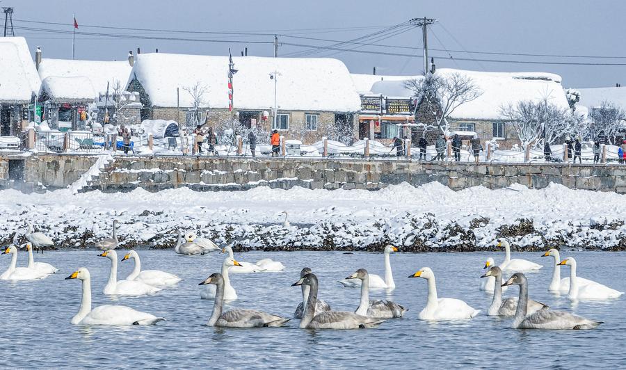Foto tirada em 17 de dezembro de 2023 mostra vista da aldeia de Yandunjiao, coberta de neve, em Rongcheng, na província de Shandong, no leste da China. (Foto por Li Xinjun/Xinhua)