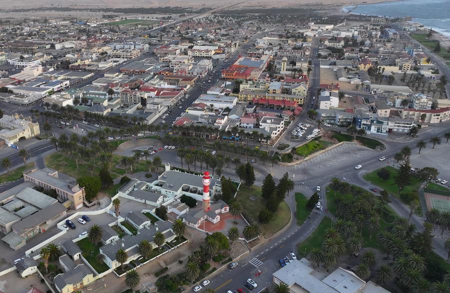 Foto aérea de drone tirada em 25 de março de 2024 mostra vista de Swakopmund, Namíbia. (Xinhua/Chen Cheng)