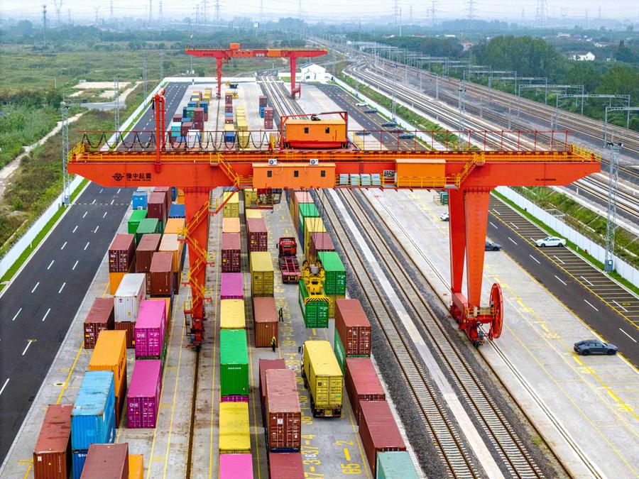 Foto aérea de drone tirada em 13 de outubro de 2025 mostra contêineres, que serão enviados por transporte intermodal ferroviário-marítimo para o Porto de Luchao, em Shanghai, para exportação, em uma base logística ferroviária em Yangzhou, província de Jiangsu, no leste da China. (Foto por Ren Fei/Xinhua)