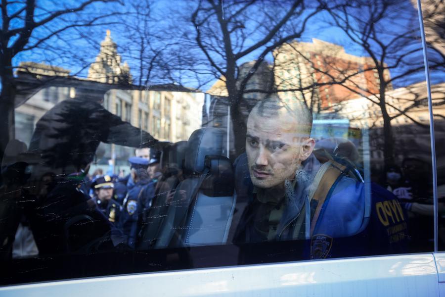 Manifestante preso é fotografo sentado em uma van do Departamento de Polícia de Nova York (NYPD, na sigla em inglês) durante protesto contra as políticas do governo Donald Trump para o Oriente Médio, protestos em universidades e imigração na cidade de Nova York, Estados Unidos, em 11 de março de 2025. (Foto de Michael Nagle/Xinhua)