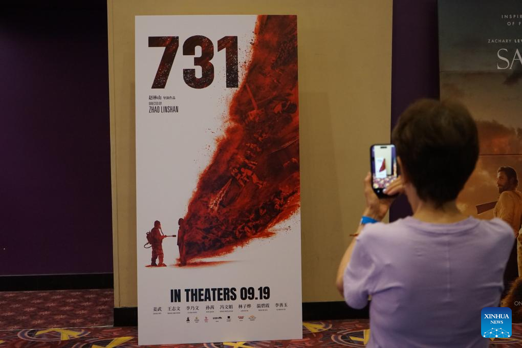 Uma espectadora tira foto de pôster do filme "Evil Unbound" em um cinema em Los Angeles, Estados Unidos, em 18 de setembro de 2025. "Evil Unbound", um filme de produção chinesa que retrata as atrocidades cometidas pela notória Unidade 731 de guerra biológica japonesa na Segunda Guerra Mundial, estreou em Los Angeles na quinta-feira. (Foto por Zeng Hui/Xinhua)
