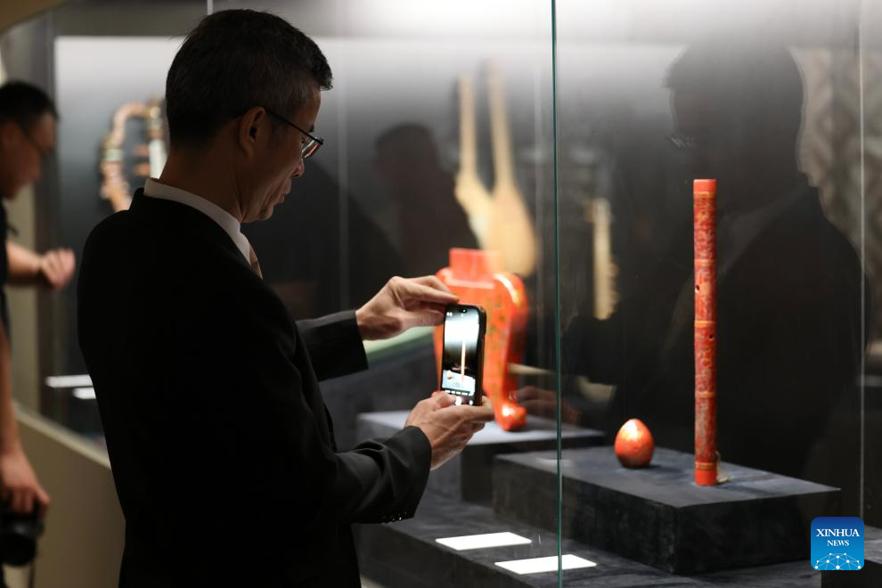 Homem fotografa objetos na exposição de instrumentos musicais chineses intitulada “O Som da Harmonia: Instrumentos Musicais na China Antiga” em Riad, Arábia Saudita, em 28 de setembro de 2025. O evento foi inaugurado na noite de domingo no Museu Nacional Saudita. A exposição apresenta mais de 100 peças e conjuntos de instrumentos musicais do Museu Nacional da China, incluindo flautas de ossos, conjuntos de sinos de bronze (Bianzhong), cítaras Guqin e flautas que traçam a evolução da música e da estética chinesas ao longo de milênios. (Xinhua/Wang Haizhou)