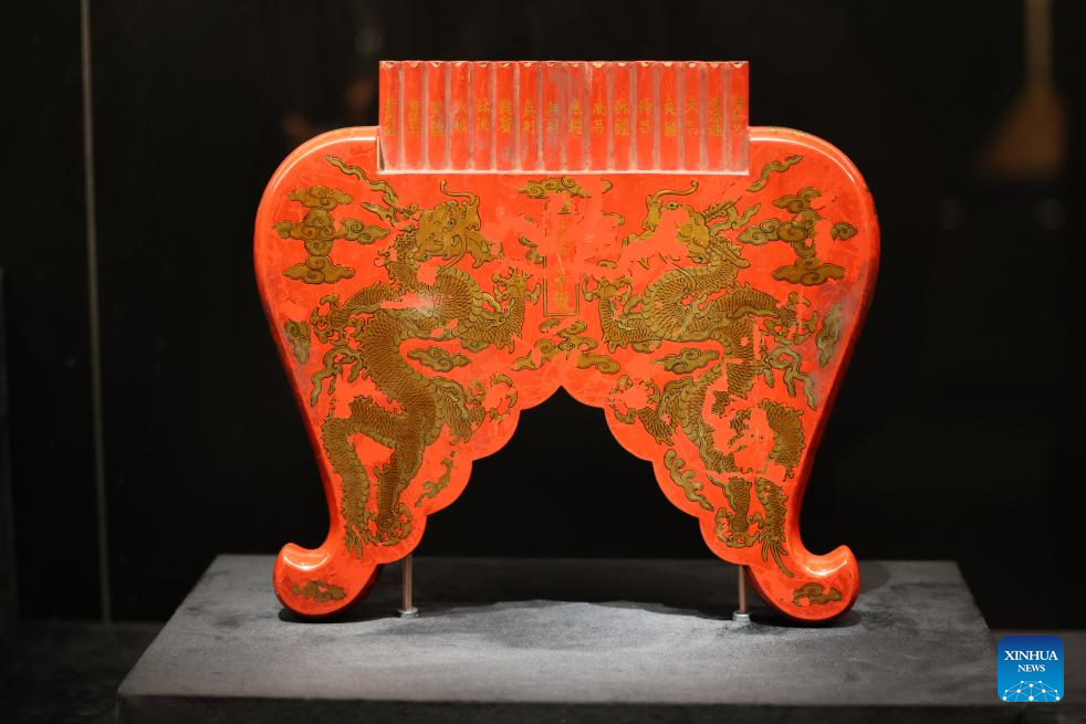 Foto tirada em 28 de setembro de 2025 mostra peças na exposição de instrumentos musicais chineses intitulada “O Som da Harmonia: Instrumentos Musicais na China Antiga”, em Riad, Arábia Saudita. O evento foi inaugurado na noite de domingo no Museu Nacional Saudita. A exposição apresenta mais de 100 peças e conjuntos de instrumentos musicais do Museu Nacional da China, incluindo flautas de ossos, conjuntos de sinos de bronze (Bianzhong), cítaras Guqin e flautas que traçam a evolução da música e da estética chinesas ao longo de milênios. (Xinhua/Wang Haizhou)