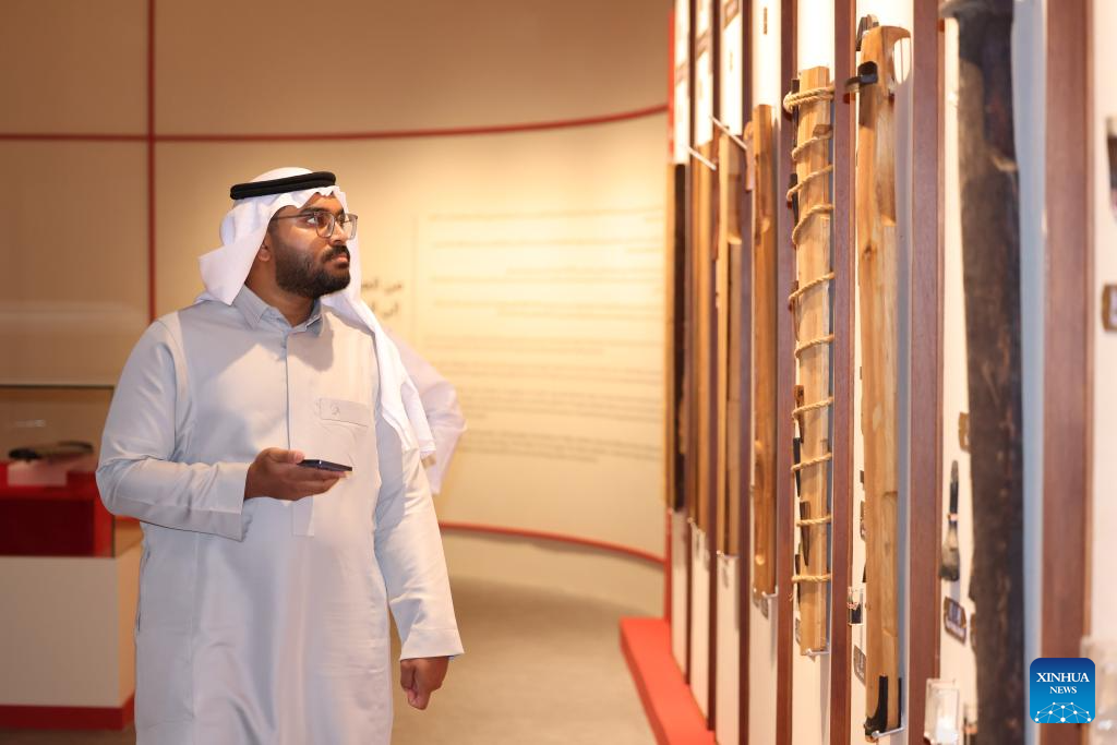 Homem visita exposição de instrumentos musicais chineses intitulada “O Som da Harmonia: Instrumentos Musicais na China Antiga” em Riad, Arábia Saudita, em 28 de setembro de 2025. O evento foi inaugurado na noite de domingo no Museu Nacional Saudita. A exposição apresenta mais de 100 peças e conjuntos de instrumentos musicais do Museu Nacional da China, incluindo flautas de ossos, conjuntos de sinos de bronze (Bianzhong), cítaras Guqin e flautas que traçam a evolução da música e da estética chinesas ao longo de milênios. (Xinhua/Wang Haizhou)