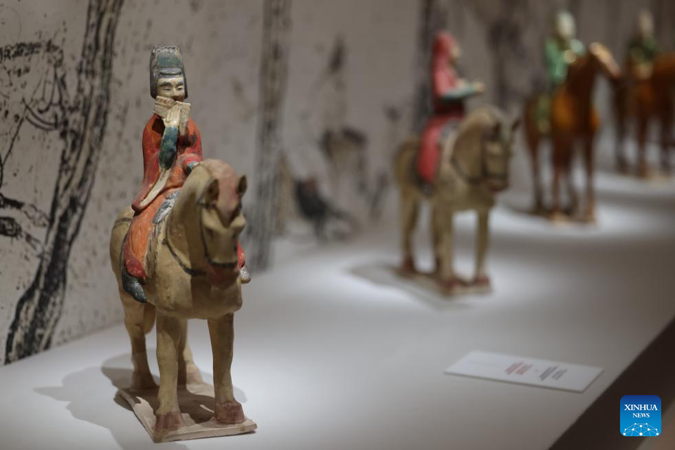 Foto tirada em 28 de setembro de 2025 mostra estátuas de músicos na exposição de instrumentos musicais chineses intitulada “O Som da Harmonia: Instrumentos Musicais na China Antiga”, em Riad, Arábia Saudita. O evento foi inaugurado na noite de domingo no Museu Nacional Saudita. A exposição apresenta mais de 100 peças e conjuntos de instrumentos musicais do Museu Nacional da China, incluindo flautas de ossos, conjuntos de sinos de bronze (Bianzhong), cítaras Guqin e flautas que traçam a evolução da música e da estética chinesas ao longo de milênios. (Xinhua/Wang Haizhou)