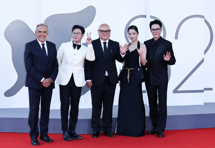 O diretor do Festival de Cinema de Veneza, Alberto Barbera (1º à esquerda), e Cai Shangjun (3º à esquerda), diretor do filme "O Sol Nasce para Todos Nós", com os membros do elenco Zhang Songwen (2º à esquerda), Xin Zhilei (2º à direita) e Feng Shaofeng posam no tapete vermelho da estreia durante o 82º Festival de Cinema de Veneza, em Veneza, Itália, em 5 de setembro de 2025. (Xinhua/Li Jing)