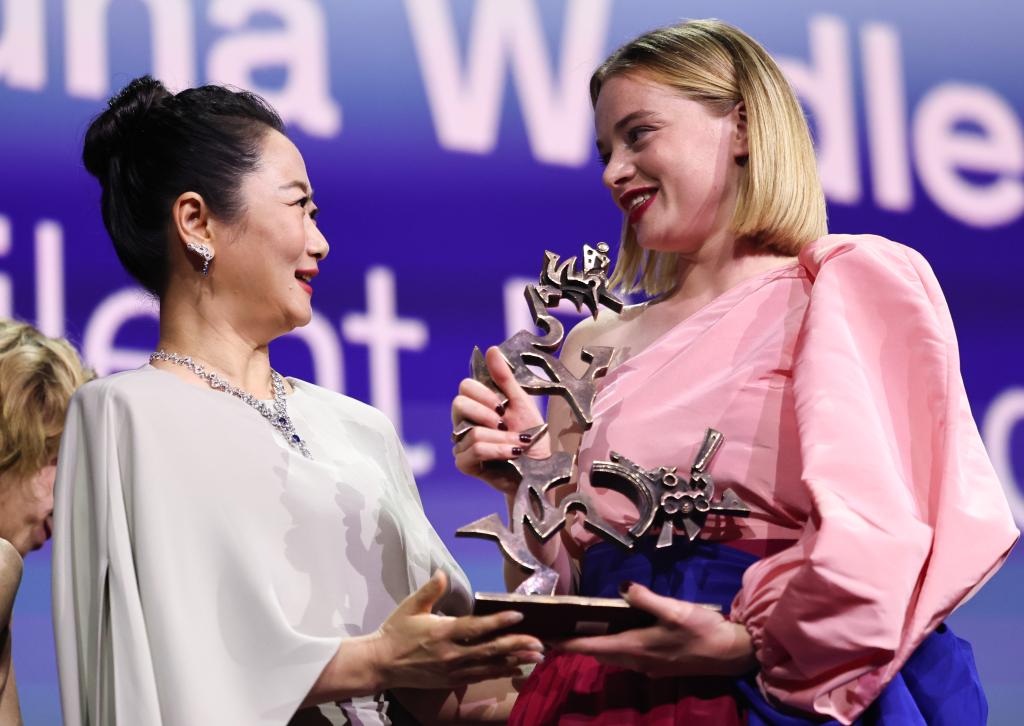 Zhao Tao (esquerda), membro do júri do 82º Festival Internacional de Cinema de Veneza, entrega troféu a Luna Wedler pelo filme "Amigo Silencioso" na cerimônia de premiação do 82º Festival Internacional de Cinema de Veneza, em Veneza, Itália, em 6 de setembro de 2025. Luna Wedler, pelo filme "Amigo Silencioso", recebeu o Prêmio Marcello Mastroianni de Melhor Atriz Jovem na noite de sábado. (Xinhua/Li Jing)