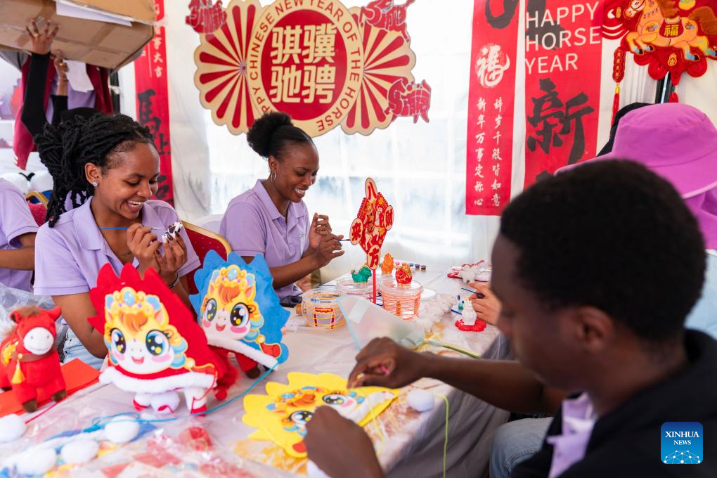 Pessoas confeccionam peças de artesanato na Gala do Ano Novo Chinês 2026 em Nairóbi, Quênia, em 8 de fevereiro de 2026. O Quênia comemorou no domingo a Gala do Ano Novo Chinês 2026 em Nairóbi, reunindo dignitários, incluindo altos funcionários do governo, diplomatas, líderes da indústria e centenas de visitantes locais e estrangeiros. O evento, que durou o dia todo e foi realizado no Shopping Two Rivers, contou com apresentações culturais como danças do dragão e do leão, música contemporânea e mostras de trajes e culinária chinesa. (Xinhua/Liu Qiong)