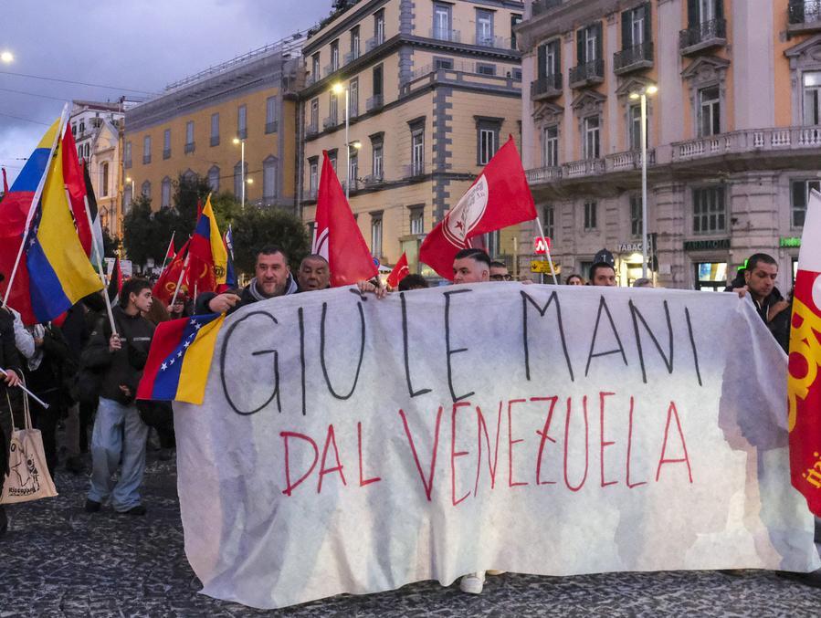 Pessoas seguram faixa em apoio à Venezuela em Nápoles, Itália, em 3 de janeiro de 2026. (Xinhua)