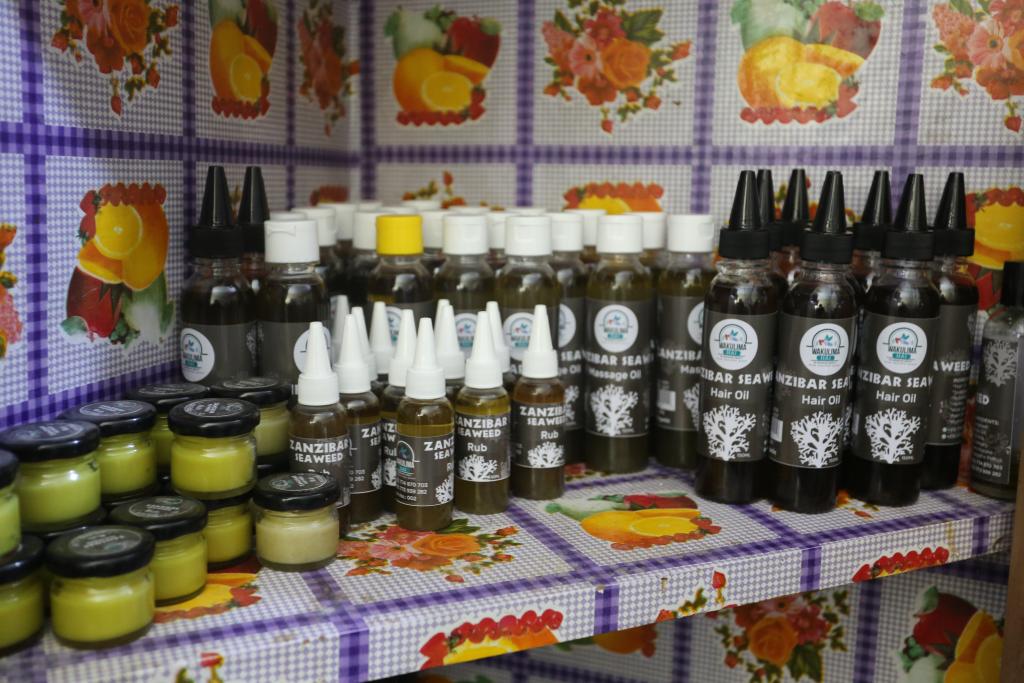Produtos à base de algas marinhas, incluindo óleo capilar, óleo de massagem e bálsamo, são exibidos na cooperativa Wakulima Hai em Zanzibar, Tanzânia, em 4 de outubro de 2025. (Xinhua/Nurdin Pallangyo)