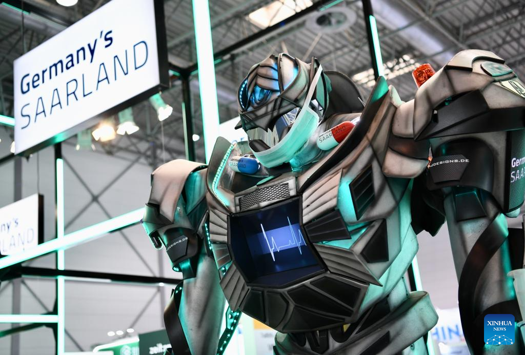Robô decorativo é fotografado na Medica 2025 em Düsseldorf, Alemanha, em 17 de novembro de 2025. Uma importante feira de dispositivos médicos começou na segunda-feira em Düsseldorf, Alemanha, com a participação de mais de 1.300 empresas chinesas. A Medica 2025 é uma das maiores e mais influentes feiras de dispositivos médicos. Esperando cerca de 80.000 visitantes de mais de 160 países e regiões, o evento deste ano focou em tecnologia e dispositivos médicos, saúde digital, laboratório e diagnóstico, tecnologia fisioterapêutica e descartáveis. Entre os participantes de todo o mundo, o número de empresas chinesas foi o maior entre os países não europeus. Segundo a organização, cerca de 70 países e regiões participaram da Medica 2025, que acontecerá até 20 de novembro. (Xinhua/Zhang Haofu)
