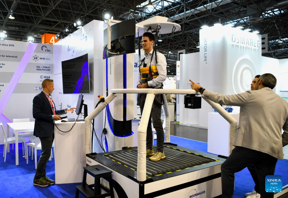 Visitante testa equipamento de reabilitação na Medica 2025 em Düsseldorf, Alemanha, em 17 de novembro de 2025. Uma importante feira de dispositivos médicos começou na segunda-feira em Düsseldorf, Alemanha, com a participação de mais de 1.300 empresas chinesas. A Medica 2025 é uma das maiores e mais influentes feiras de dispositivos médicos. Esperando cerca de 80.000 visitantes de mais de 160 países e regiões, o evento deste ano focou em tecnologia e dispositivos médicos, saúde digital, laboratório e diagnóstico, tecnologia fisioterapêutica e descartáveis. Entre os participantes de todo o mundo, o número de empresas chinesas foi o maior entre os países não europeus. Segundo a organização, cerca de 70 países e regiões participaram da Medica 2025, que acontecerá até 20 de novembro. (Xinhua/Zhang Haofu)