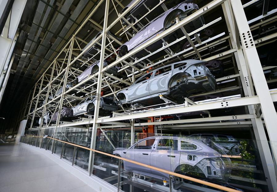 Foto mostra o Sistema de Armazenamento Vertical "Cubo" na Segunda Base de Fabricação Avançada da NIO em Hefei, província de Anhui, no leste da China, em 1º de julho de 2025. (Xinhua/Zhou Mu)