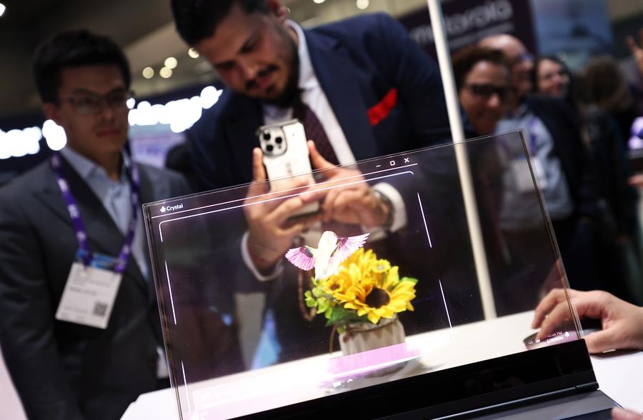 Visitantes conhecem o conceito do laptop com tela transparente Lenovo ThinkBook no Congresso Mundial de Telefonia Móvel 2024 (MWC, na sigla em inglês) em Barcelona, Espanha, em 28 de fevereiro de 2024. (Xinhua/Gao Jing)