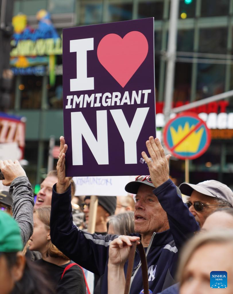 Na cidade de Nova York, mais de 100.000 manifestantes lotaram a Times Square, agitando cartazes com os dizeres "Ódio não tornará os EUA grandes", "ICE (Serviço de Imigração e Alfândega dos EUA) fora de Nova York", "Saúde é um direito, não um privilégio" e "Defenda nossa Constituição". Gritos de "Nós, povos unidos, jamais seremos divididos" e "ICE fora das ruas" ecoaram pela multidão.