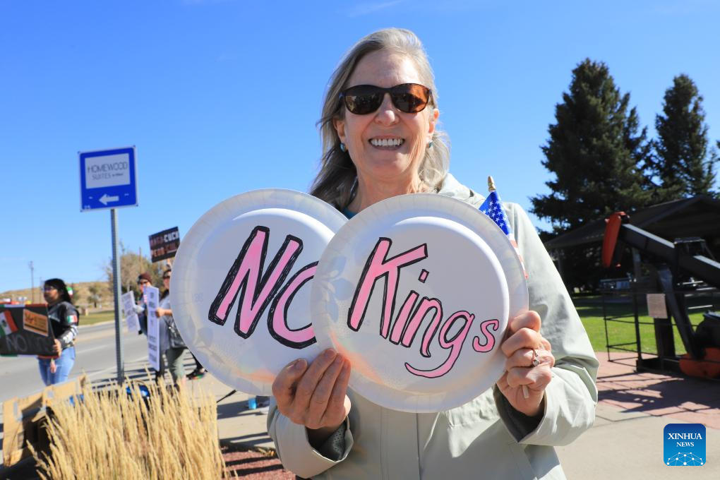 Mulher participa do protesto "No Kings" ("Sem Reis", em tradução livre) em Rock Springs, Wyoming, Estados Unidos, em 18 de outubro de 2025. Milhares de pessoas foram às ruas em 2.700 cidades e vilas americanas no sábado para a segunda rodada dos protestos nacionais "No Kings", a maior manifestação em um único dia na história americana. Após o primeiro protesto nacional "No Kings" em 14 de junho, esta rodada de manifestações, abrangendo todos os 50 estados, ocorreu quando a paralisação do governo federal entrou em seu 18º dia sem resoluções à vista. (Xinhua/Shi Chun)