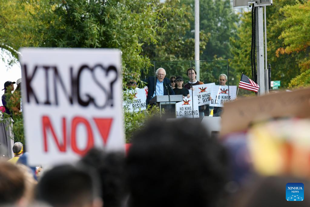 O senador americano Bernie Sanders (centro) discursa no protesto "No Kings" ("Sem Reis", em tradução livre) em Washington, D.C., Estados Unidos, em 18 de outubro de 2025. Milhares de pessoas foram às ruas em 2.700 cidades e vilas americanas no sábado para a segunda rodada dos protestos nacionais "No Kings", a maior manifestação em um único dia na história americana. Após o primeiro protesto nacional "No Kings" em 14 de junho, esta rodada de manifestações, abrangendo todos os 50 estados, ocorreu quando a paralisação do governo federal entrou em seu 18º dia sem resoluções à vista. (Xinhua/Li Rui)