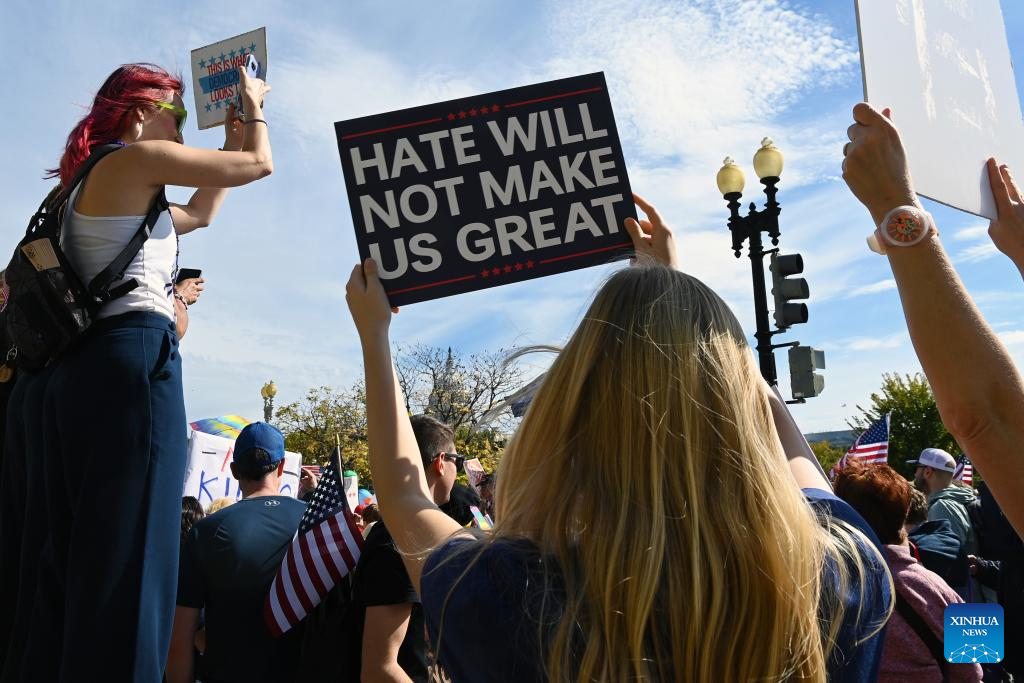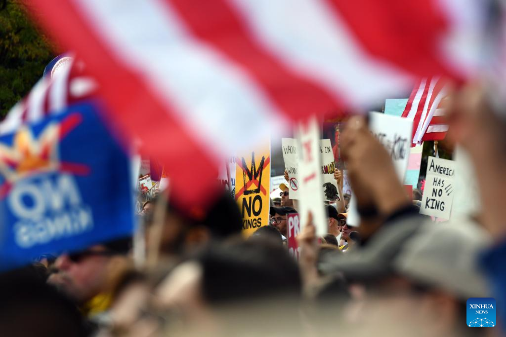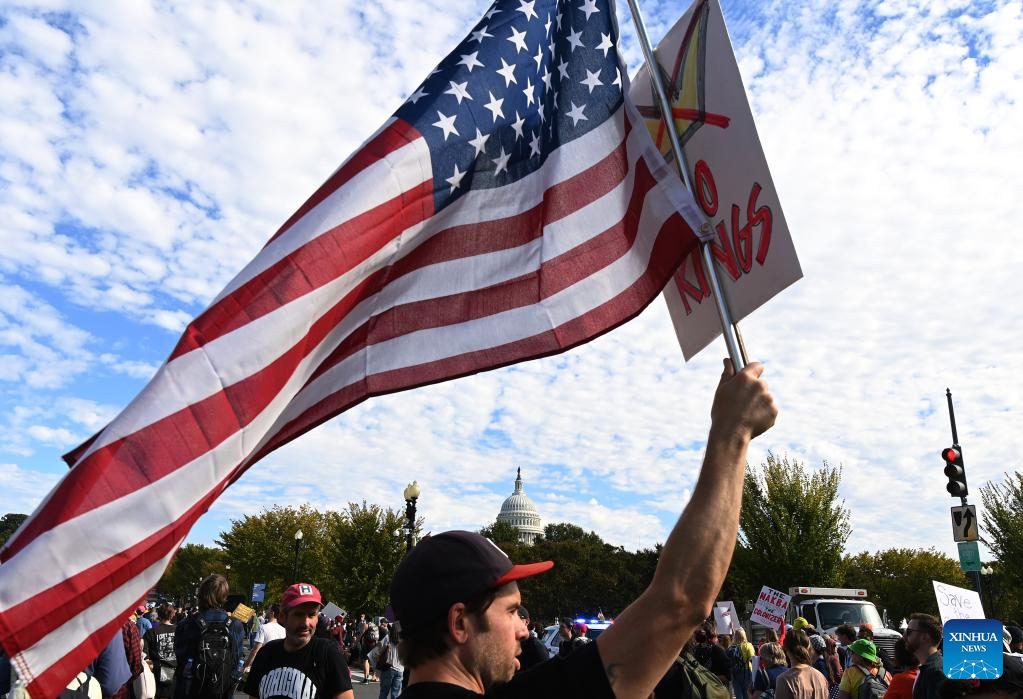 Pessoas participam do protesto "No Kings" ("Sem Reis", em tradução livre) em Washington, D.C., Estados Unidos, em 18 de outubro de 2025. Milhares de pessoas foram às ruas em 2.700 cidades e vilas americanas no sábado para a segunda rodada dos protestos nacionais "No Kings", a maior manifestação em um único dia na história americana. Após o primeiro protesto nacional "No Kings" em 14 de junho, esta rodada de manifestações, abrangendo todos os 50 estados, ocorreu quando a paralisação do governo federal entrou em seu 18º dia sem resoluções à vista. (Xinhua/Li Rui)