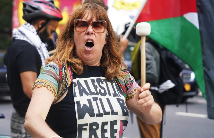 Uma manifestante participa de protesto em apoio à Palestina perto da sede da ONU em Nova York, em 22 de setembro de 2025. (Xinhua/Wu Xiaoling)
