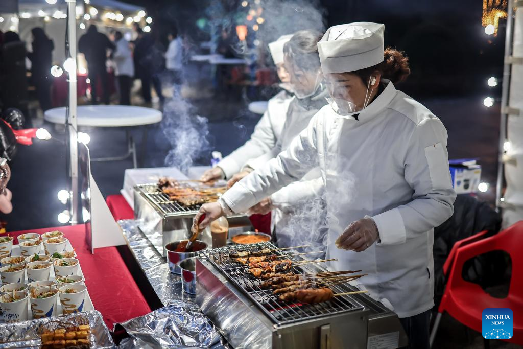 Vendedoras vendem comida grelhada no evento "Um Gosto da China, Noites de Comida Chinesa" realizado no Jardim Zoológico e Botânico de Budapeste, Hungria, em 30 de janeiro de 2026. (Foto de David Balogh/Xinhua)