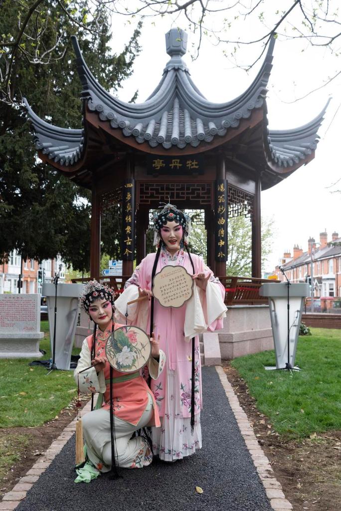 Foto de arquivo tirada em 26 de abril de 2019 mostra artistas chinesas posando para foto em frente ao Pavilhão das Peônias no Jardim Firs em Stratford-upon-Avon, Reino Unido. (Foto por Ray Tang/Xinhua)