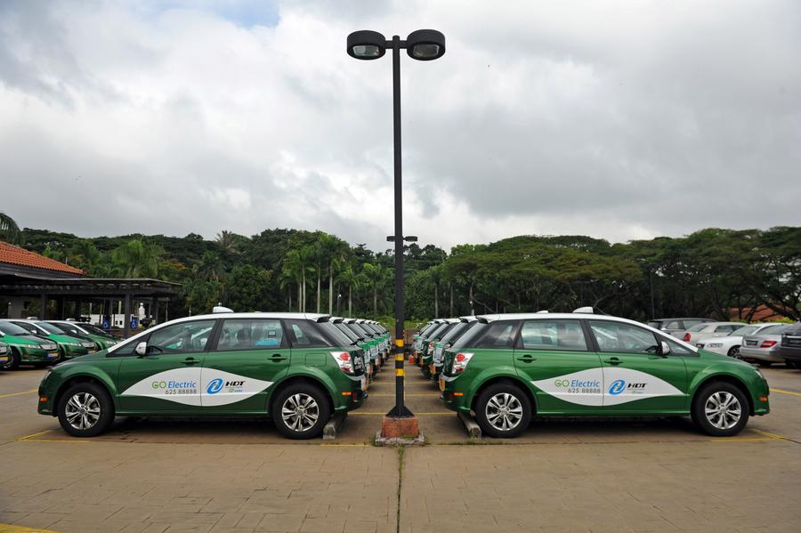 Táxis elétricos da HDT estacionados no local do evento de lançamento do Táxi Elétrico HDT, realizado em Cingapura em 24 de fevereiro de 2017. (Xinhua/Then Chih Wey)