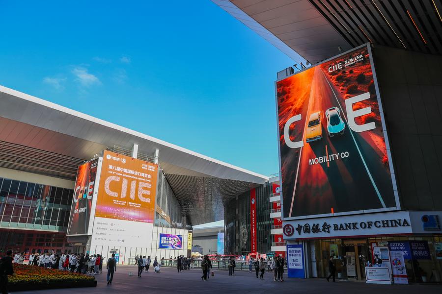 Pessoas caminham no Centro Nacional de Exposições e Convenções (Shanghai), o principal local da 8ª edição da Exposição Internacional de Importação da China (CIIE), em Shanghai, no leste da China, em 10 de novembro de 2025. (Xinhua/Wang Jingqiang)