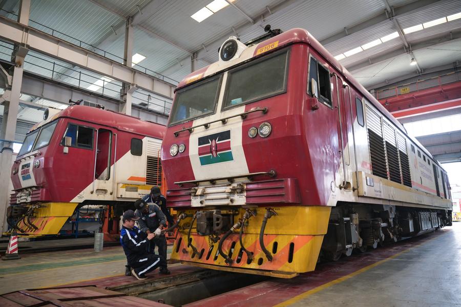 Trabalhadores verificam locomotiva na oficina de manutenção de locomotivas da Africa Star Railway Operation Company Limited (Afristar) em Nairóbi, Quênia, em 19 de agosto de 2025. (Xinhua/Yang Guang)