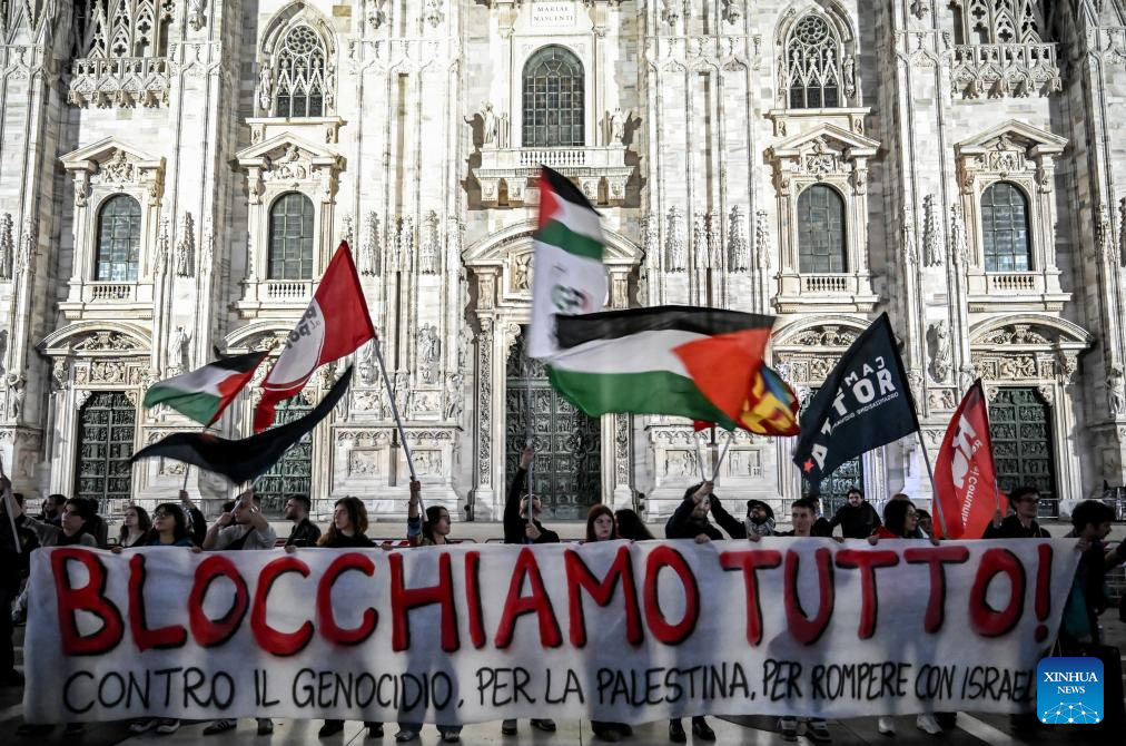 Manifestantes se reúnem em frente à Catedral de Milão, em Milão, Itália, em 1º de outubro de 2025. (Str/Xinhua)