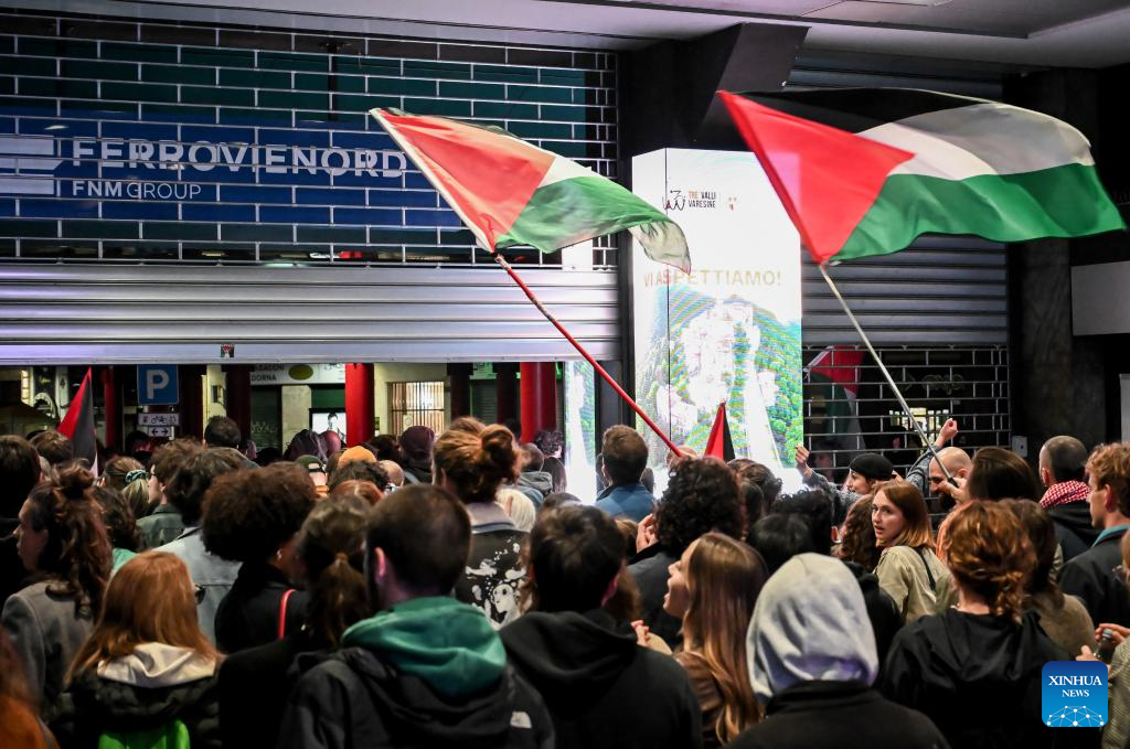 Manifestantes se reúnem na Estação Ferroviária de Cadorna, em Milão, Itália, em 1º de outubro de 2025. (Str/Xinhua)