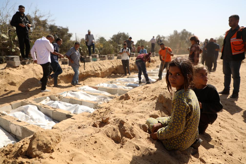 Foto tirada em 22 de outubro de 2025 mostra enterro de corpos não identificados de palestinos em Deir al-Balah, no centro da Faixa de Gaza. (Foto por Rizek Abdeljawad/Xinhua)