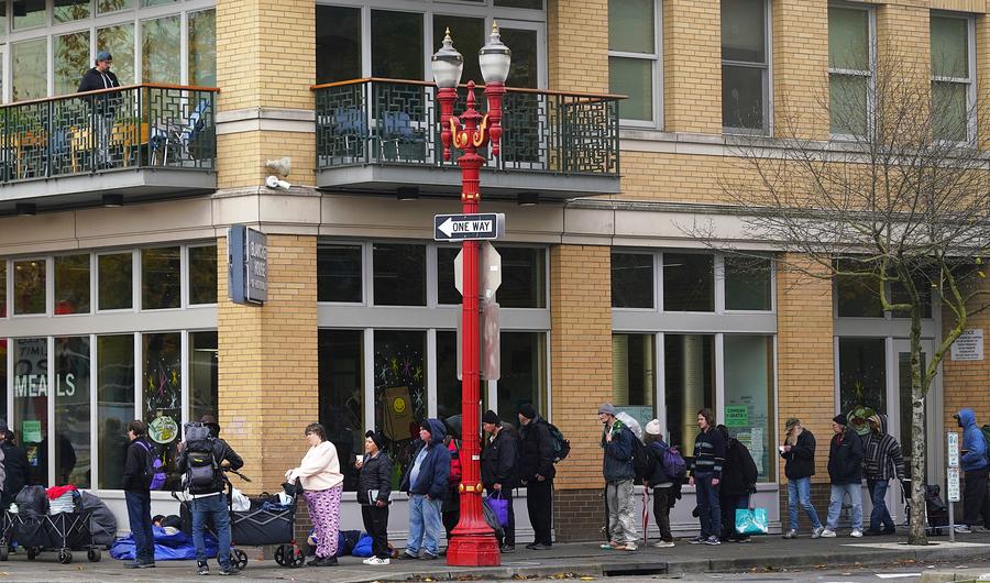 Pessoas aguardam para receber comida gratuita na rua em Portland, Oregon, Estados Unidos, em 4 de novembro de 2025. O Senado dos EUA falhou novamente na terça-feira em aprovar um projeto de lei de financiamento temporário, marcando a 14ª tentativa fracassada. Isso significa que a paralisação do governo federal está a caminho de superar o recorde de 35 dias estabelecido durante a paralisação de 2018-2019 e se tornar a mais longa da história dos EUA. (Xinhua/Wu Xiaoling)