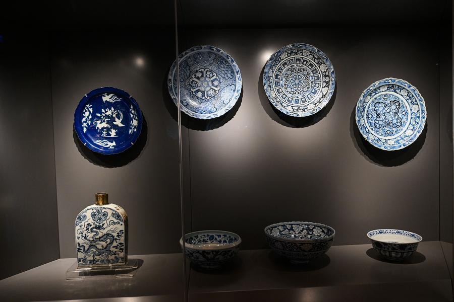 Peças de porcelana chinesa são exibidas na principal loja oficial de porcelana de Jingdezhen em Istambul, Turquia, em 31 de maio de 2025. (Xinhua/Liu Lei)