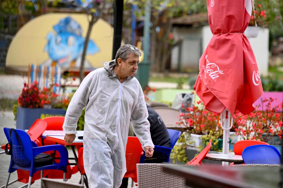 Um funcionário com traje de proteção caminha no Zoológico de Skopje, fechado ao público, em Skopje, República da Macedônia do Norte, em 19 de outubro de 2024. O principal zoológico de Skopje, capital da Macedônia do Norte, foi fechado no sábado após a confirmação de um caso de gripe aviária H5N1, de acordo com a Agência de Alimentos e Veterinária. (Foto por Tomislav Georgiev/Xinhua)
