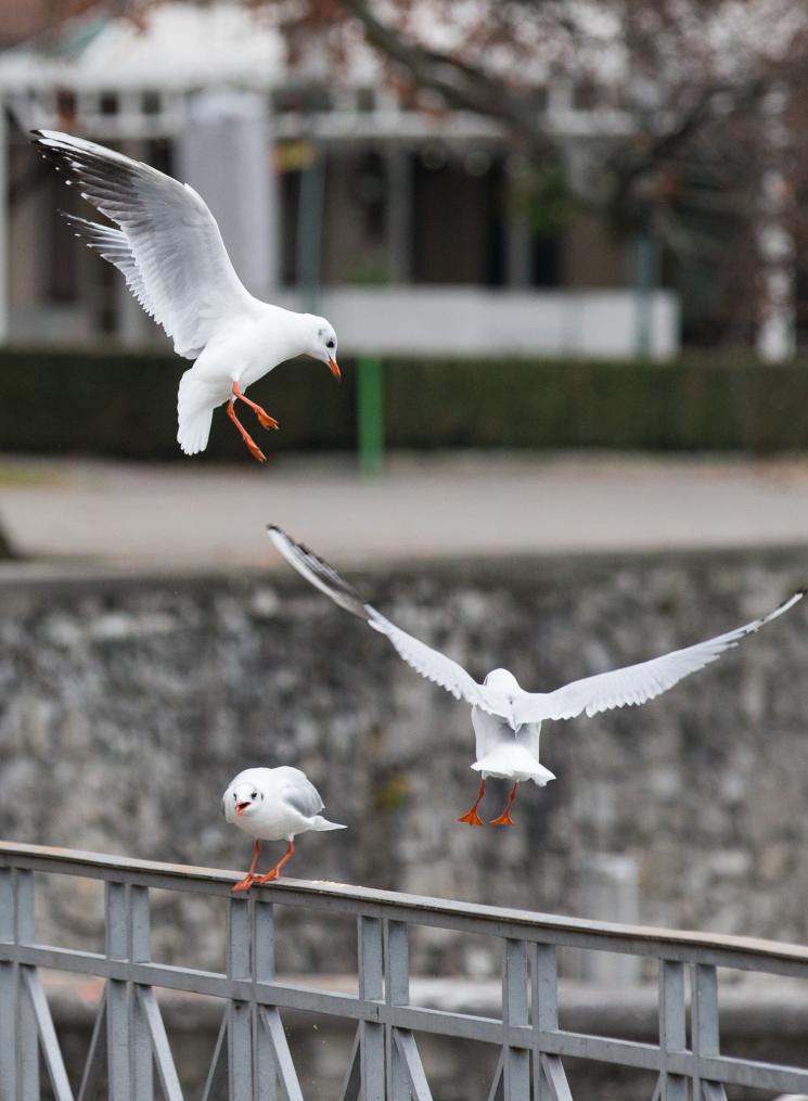 Gaivotas voam sobre o lago Leman em Genebra, Suíça, 21 de novembro de 2016. (Xinhua/Xu Jinquan) (zjy)