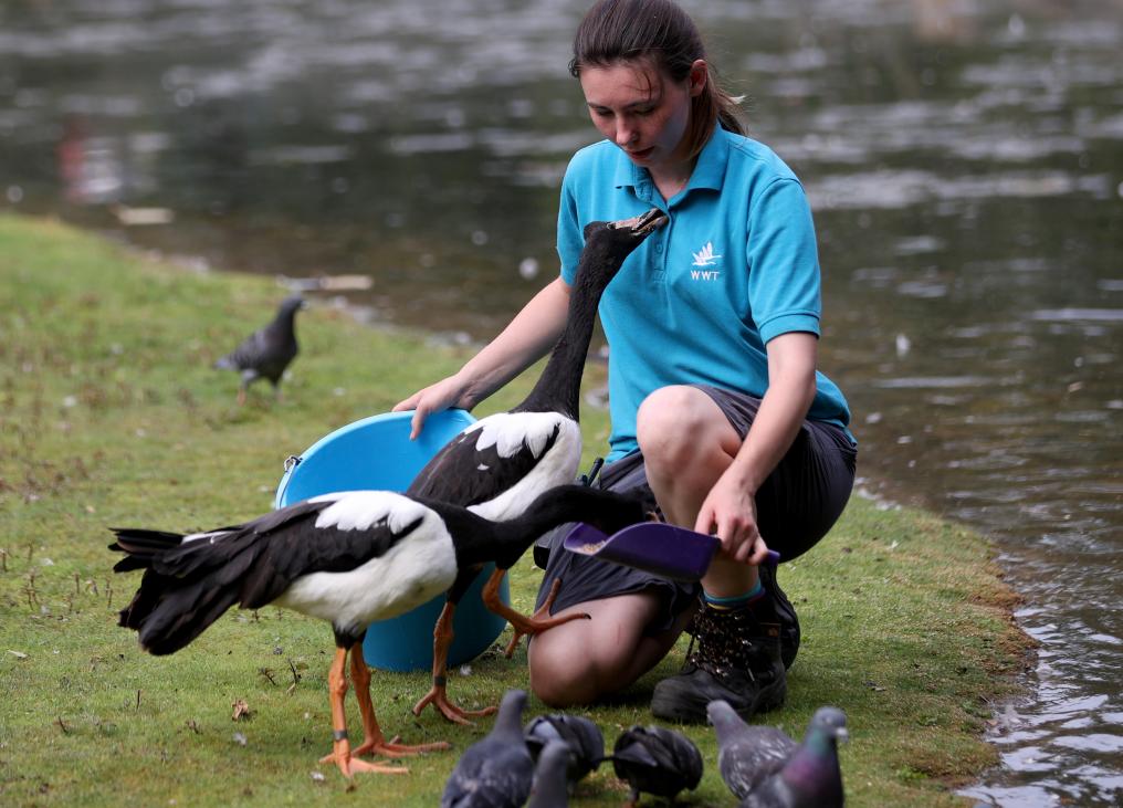 Uma funcionária alimenta gansos-pega no Centro de Zonas Húmidas de Londres, em Londres, Reino Unido, em 20 de junho de 2025. Como parte importante do ecossistema mundial, as zonas úmidas desempenham um papel fundamental em muitos aspectos, incluindo ecologia, meio ambiente, economia e sociedade. (Xinhua/Li Ying)
