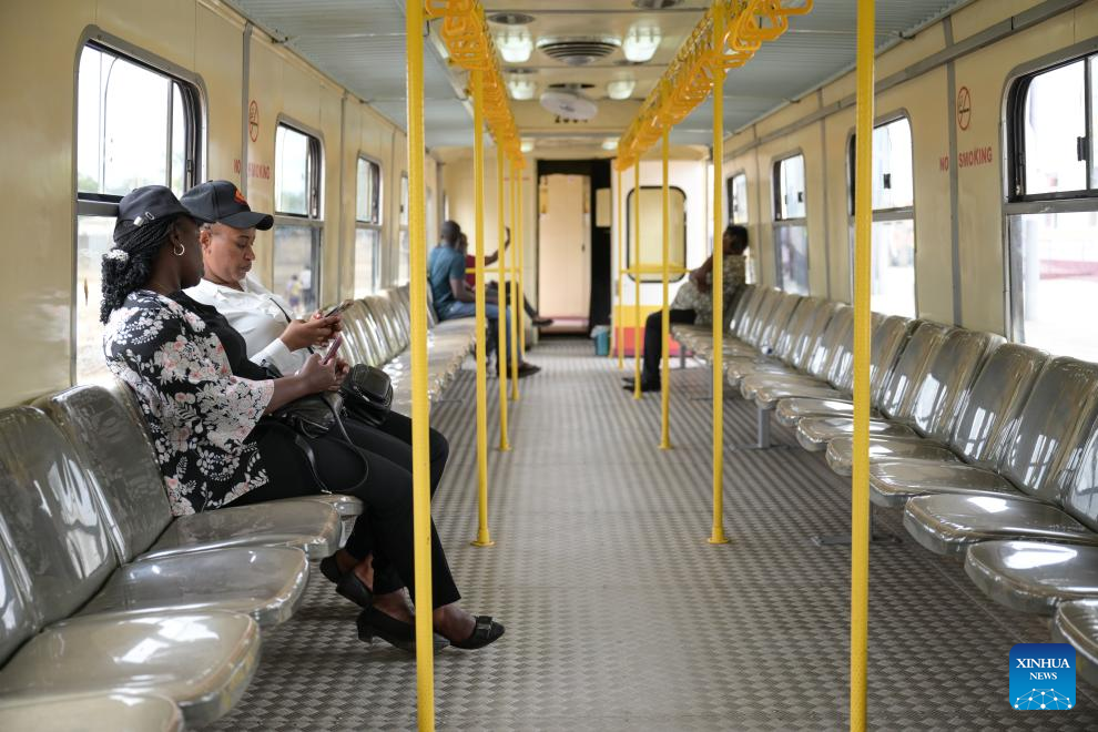 Pessoas são fotografadas em vagão do serviço ferroviário suburbano de Mombasa no terminal Miritini SGR em Mombasa, Quênia, em setembro. 17 de setembro de 2025. O presidente queniano, William Ruto, inaugurou na quarta-feira o serviço ferroviário suburbano de Mombasa, que ligará trechos do centro da cidade portuária a um terminal ferroviário de bitola padrão (SGR, na sigla em inglês), o que facilitará a mobilidade de passageiros e de mercadorias. (Xinhua/Yang Guang)