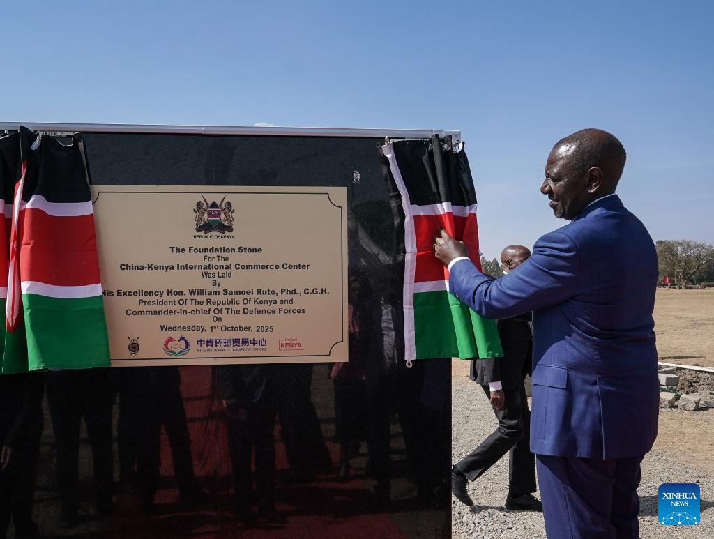 O presidente queniano, William Ruto, participa da cerimônia de inauguração do Centro de Comércio Internacional China-Quênia em Nairóbi, Quênia, em 1º de outubro de 2025. Ruto inaugurou na quarta-feira a construção do Centro de Comércio Internacional China-Quênia, um projeto de cinco bilhões de xelins (cerca de 38,7 milhões de dólares americanos), destinado a fortalecer o comércio e os investimentos sino-quenianos. De acordo com Ruto, a instalação apresentará produtos da China, além de produtos fabricados localmente e destinados aos mercados globais. (Xinhua/Han Xu)