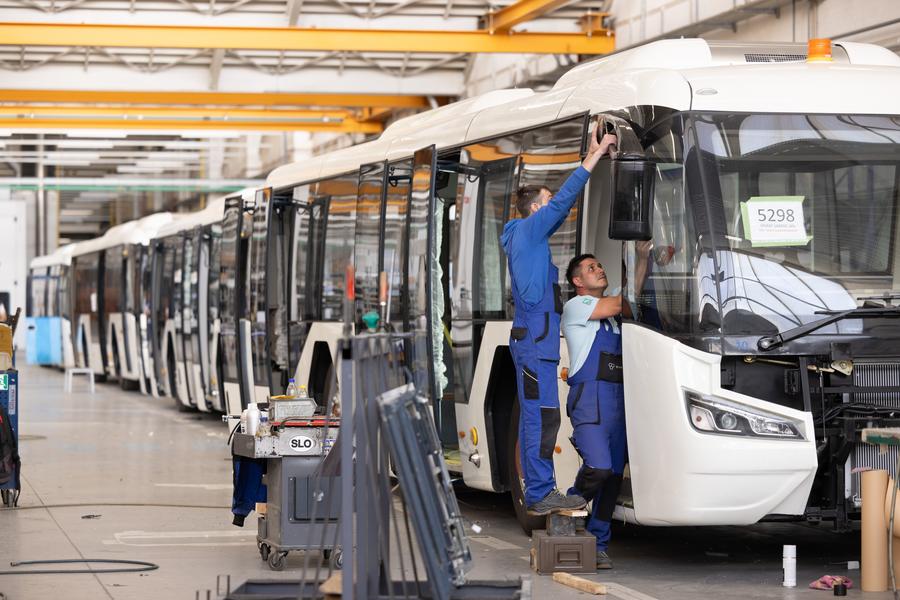 Funcionário da TAM trabalha na linha de produção de ônibus elétricos para o Aeroporto Charles de Gaulle de Paris em Maribor, Eslovênia, em 14 de junho de 2024. A TAM, uma das principais fabricantes de ônibus e veículos comerciais da Eslovênia, está passando por uma significativa revitalização após sua aquisição pela China. (Foto por Zeljko Stevanic/Xinhua)