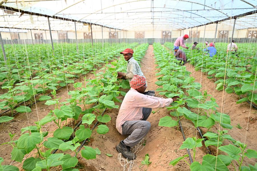 Trabalhadores na fazenda de Sari Al-Azmi na província de Ahmadi, Kuwait, em 31 de outubro de 2025. (Foto por Asad/Xinhua)