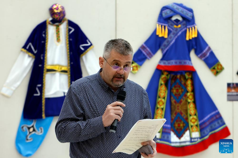 O vice-reitor da Universidade de Bucareste, Mugur Zlotea, discursa na cerimônia de abertura da exposição "Vestuário Esplêndido - Trajes Étnicos Chineses", em Bucareste, Romênia, em 11 de novembro de 2025. Uma exposição que apresenta trajes tradicionais de grupos étnicos minoritários da China foi inaugurada na terça-feira no Palácio do Parlamento em Bucareste, atraindo moradores locais e turistas. (Foto por Cristian Cristel/Xinhua)