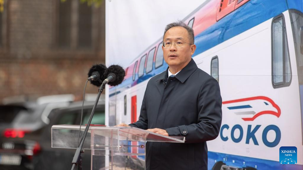 O embaixador chinês na Sérvia, Li Ming, discursa na cerimônia de inauguração do trecho Novi Sad-Subotica da ferrovia de alta velocidade Hungria-Sérvia, em Subotica, Sérvia, em 3 de outubro de 2025. O presidente sérvio, Aleksandar Vucic, inaugurou na sexta-feira o trecho Novi Sad-Subotica da ferrovia de alta velocidade Hungria-Sérvia, marcando a inauguração do trecho sérvio do projeto regional histórico. (Foto por Wang Wei/Xinhua)