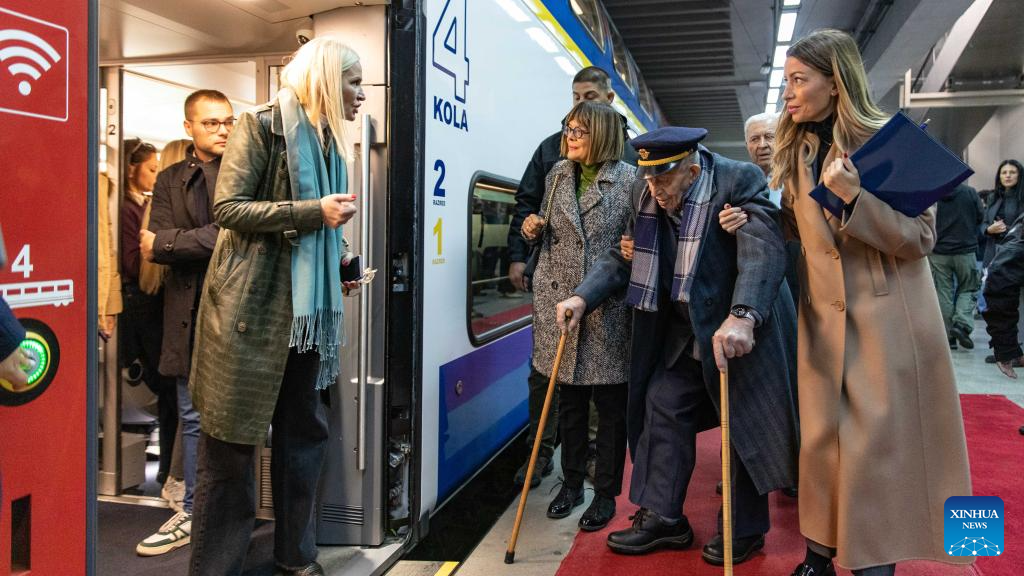 Pessoas auxiliam um sérvio de 105 anos a embarcar no trem da ferrovia de alta velocidade Hungria-Sérvia, em Belgrado, Sérvia, em 3 de outubro de 2025. O presidente sérvio, Aleksandar Vucic, inaugurou na sexta-feira o trecho Novi Sad-Subotica da ferrovia de alta velocidade Hungria-Sérvia, marcando a inauguração do trecho sérvio do projeto regional histórico. (Foto por Wang Wei/Xinhua)