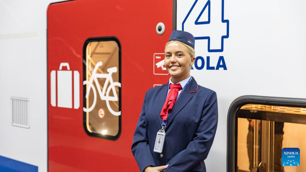 Uma condutora aguarda embarque de passageiros no trem da ferrovia de alta velocidade Hungria-Sérvia, em Belgrado, Sérvia, em 3 de outubro de 2025. O presidente sérvio, Aleksandar Vucic, inaugurou na sexta-feira o trecho Novi Sad-Subotica da ferrovia de alta velocidade Hungria-Sérvia, marcando a inauguração do trecho sérvio do projeto regional histórico. (Foto por Wang Wei/Xinhua)