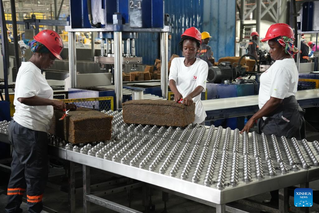 Trabalhadoras embalam blocos de borracha padronizados em uma fábrica de processamento de borracha do Grupo Mainland da China em San Pedro, Costa do Marfim, em 9 de abril de 2026. (Xinhua/Zhang Jian)